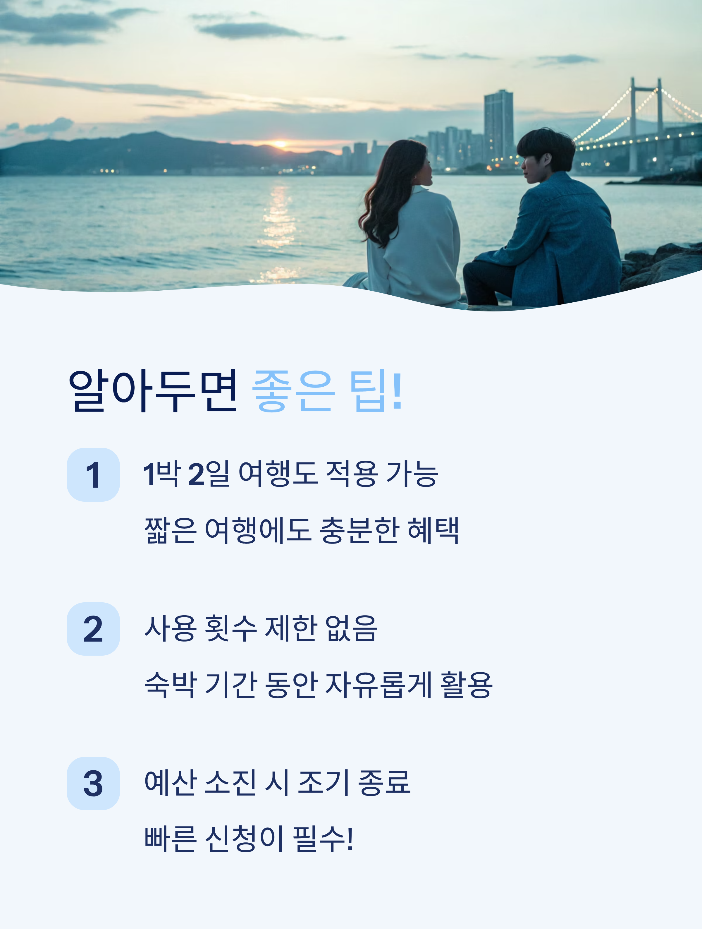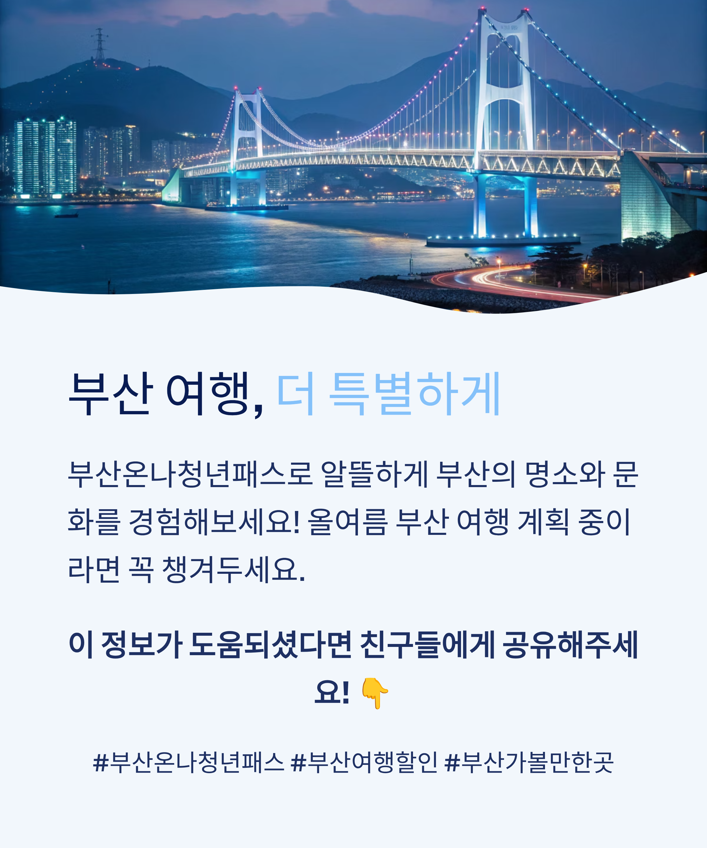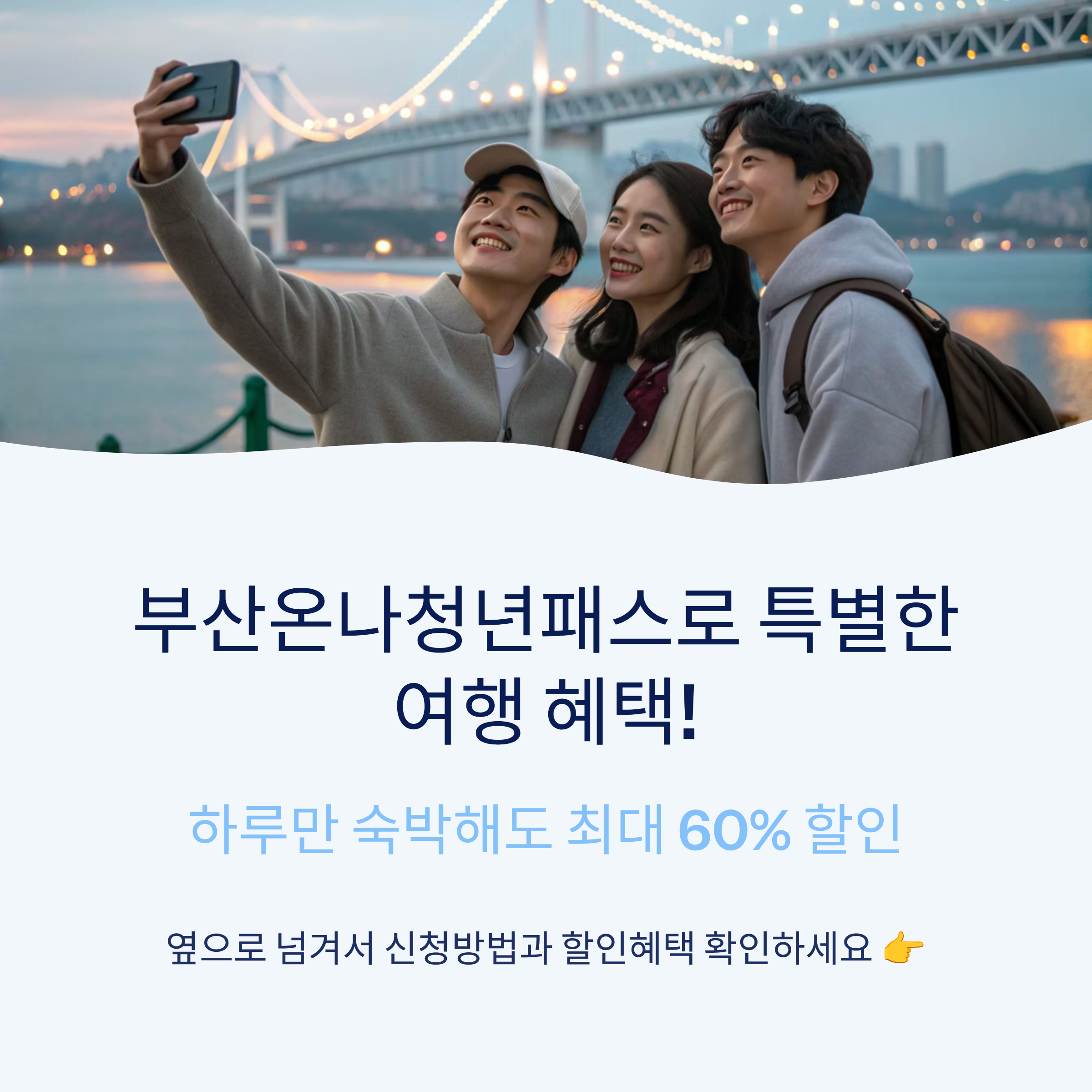 부산온나청년패스는 단순한 할인 카드가 아니라, 부산을 더 깊이 경험할 수 있는 여행 동반자 같은 존재입니다. 숙박만 하면 제휴처에서 무제한으로 할인 혜택을 받을 수 있어 여행 경비는 줄이고 즐거움은 배가됩니다. 이번 여름과 가을, 부산에서 특별한 시간을 보내고 싶다면 망설이지 말고 서둘러 신청해보세요. 여행의 만족도가 달라집니다.