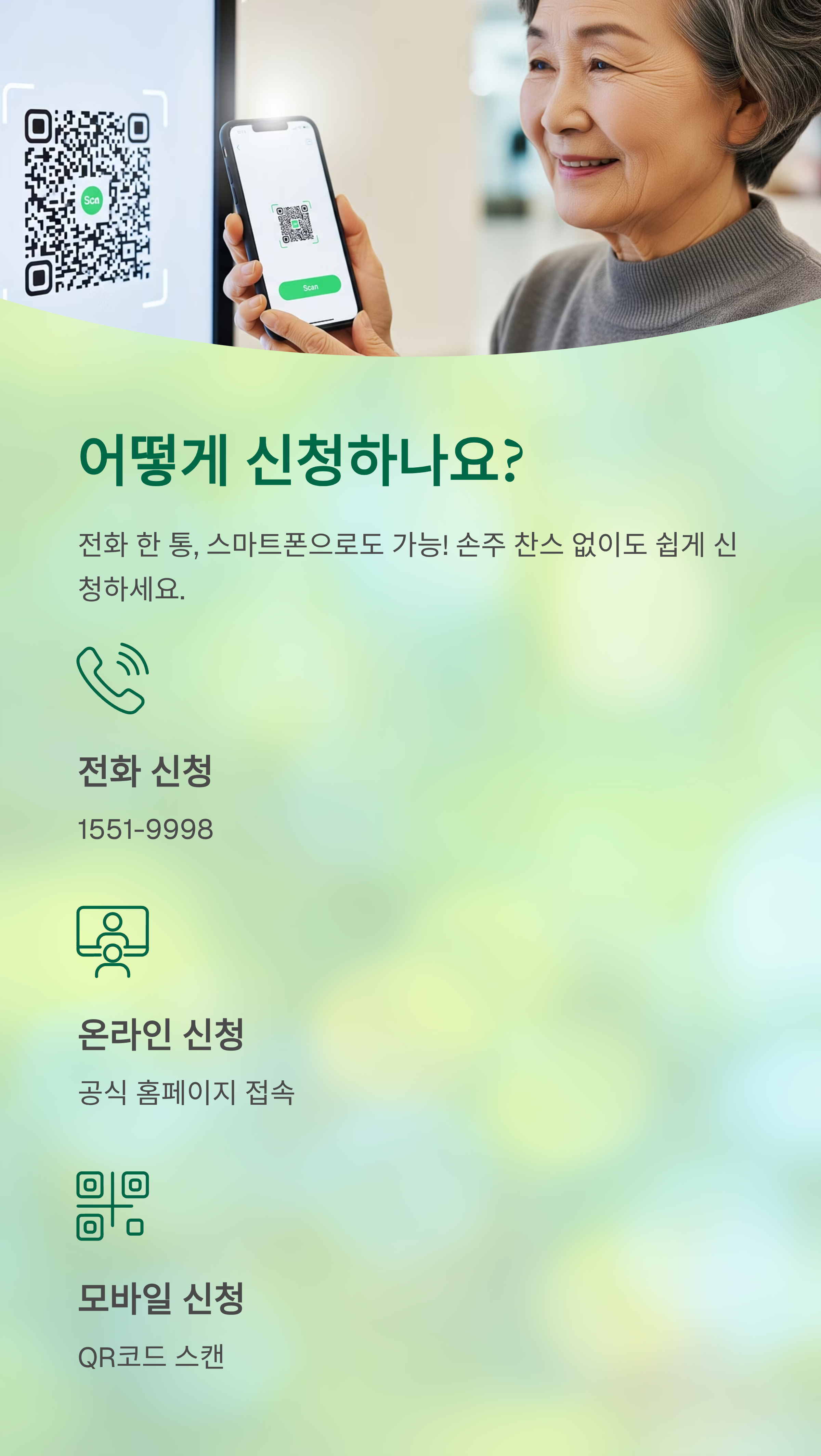 신청은 전화, 온라인, 모바일로 간편하게 하실 수 있습니다.