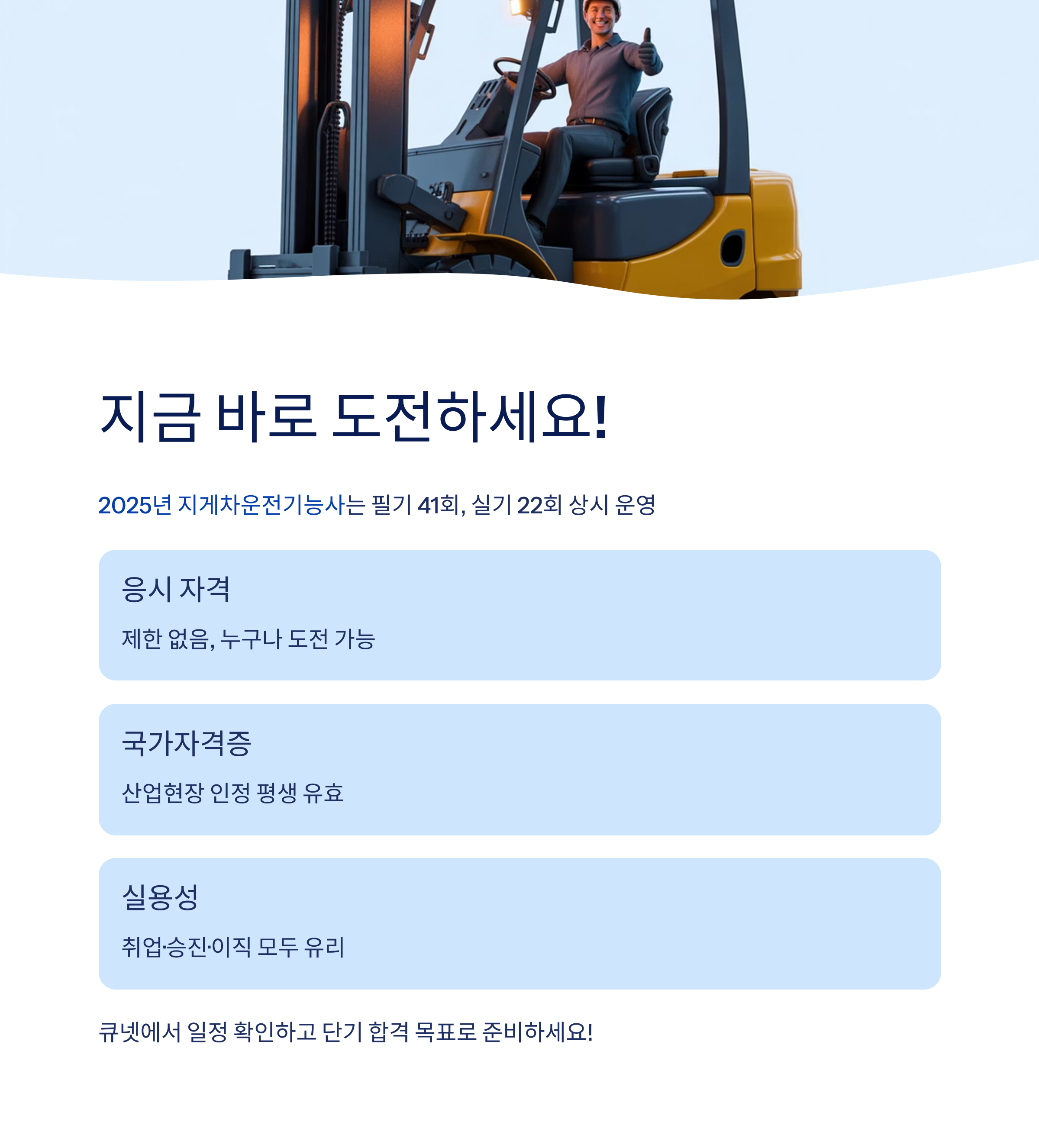 2025년 지게차운전기능사 시험은 필기 41회, 실기 22회로 연중 상시 운영됩니다.