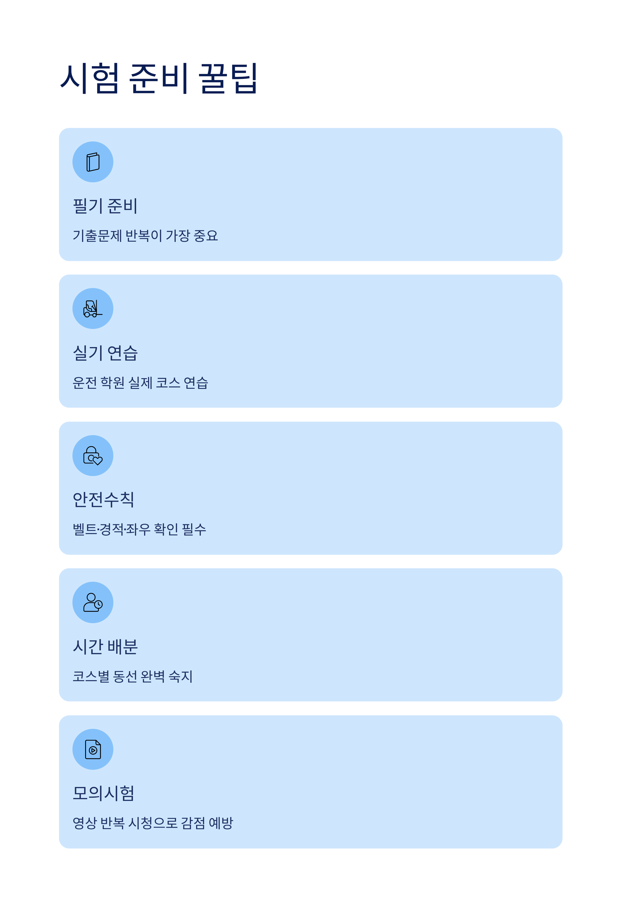 모의시험 영상을 반복 시청해 동선과 감점 포인트를 숙지하세요.