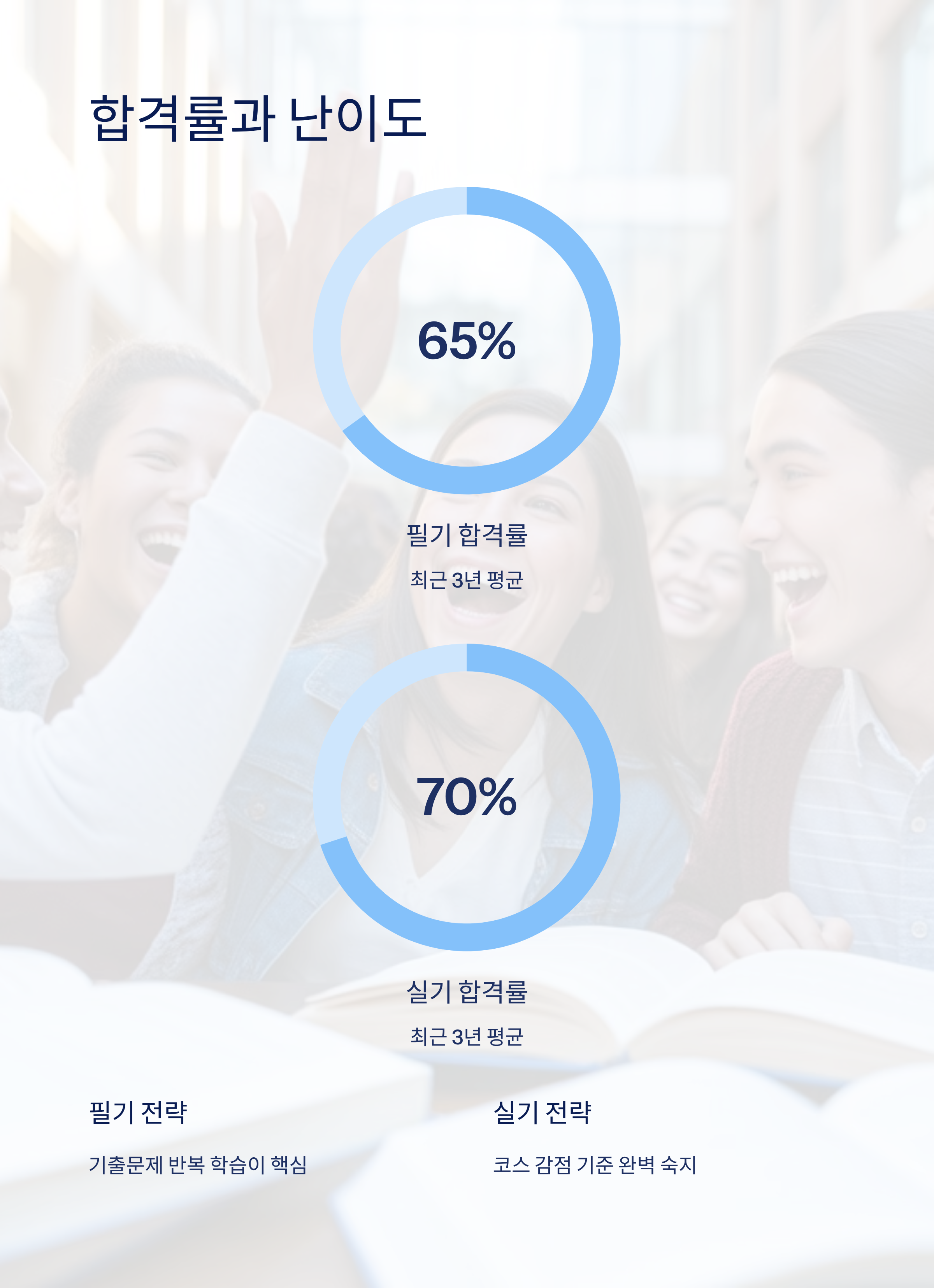 최근 3년 기준 필기 평균 합격률은 65퍼센트, 실기 합격률은 70퍼센트 수준입니다.