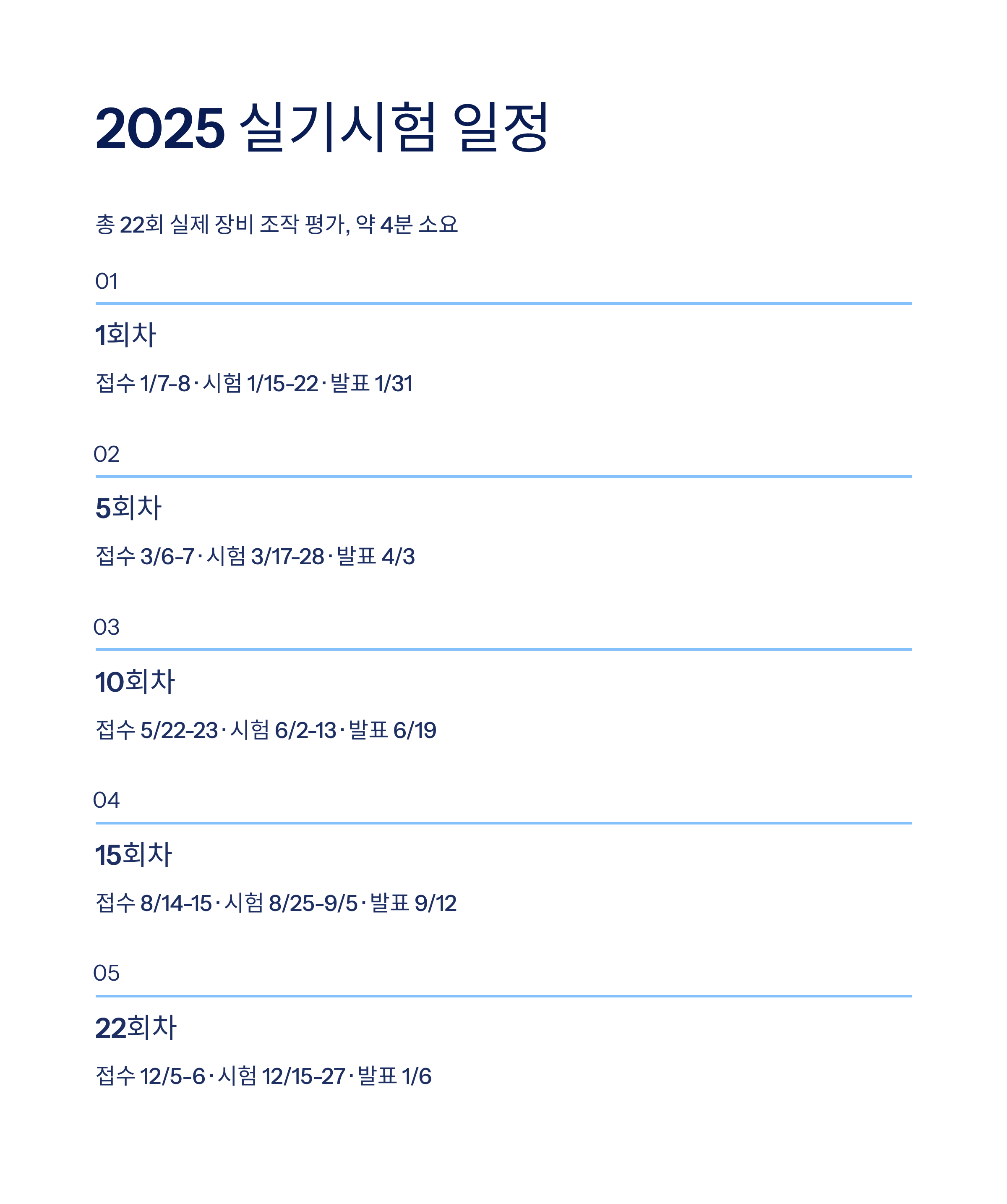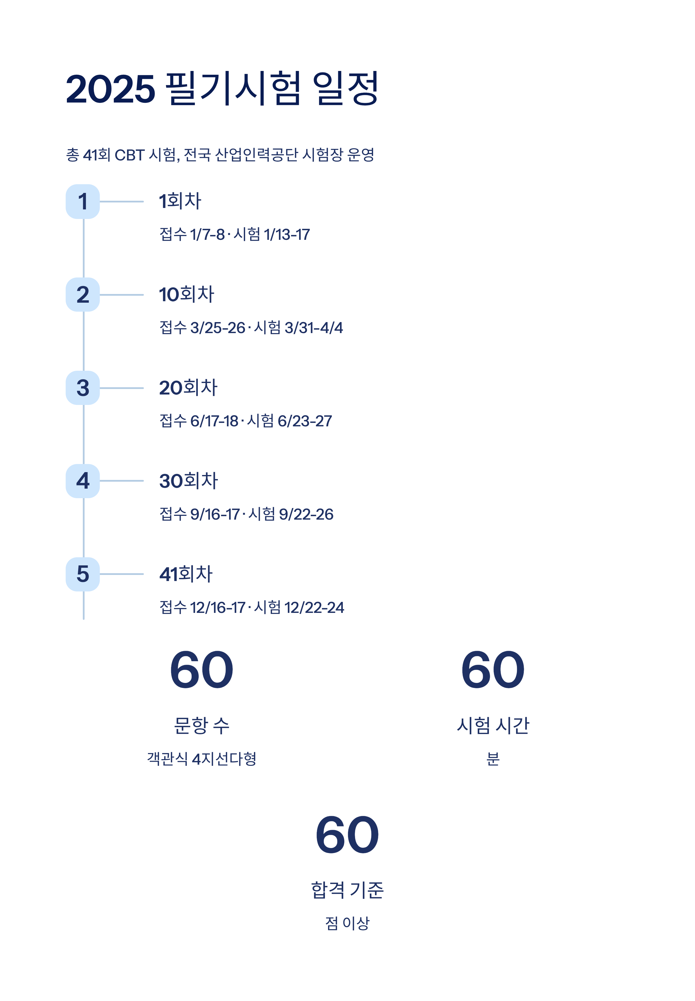 2025년에는 큐넷(Q-Net) 기준으로 필기시험 41회, 실기시험 22회가 연중 상시로 운영될 예정입니다.