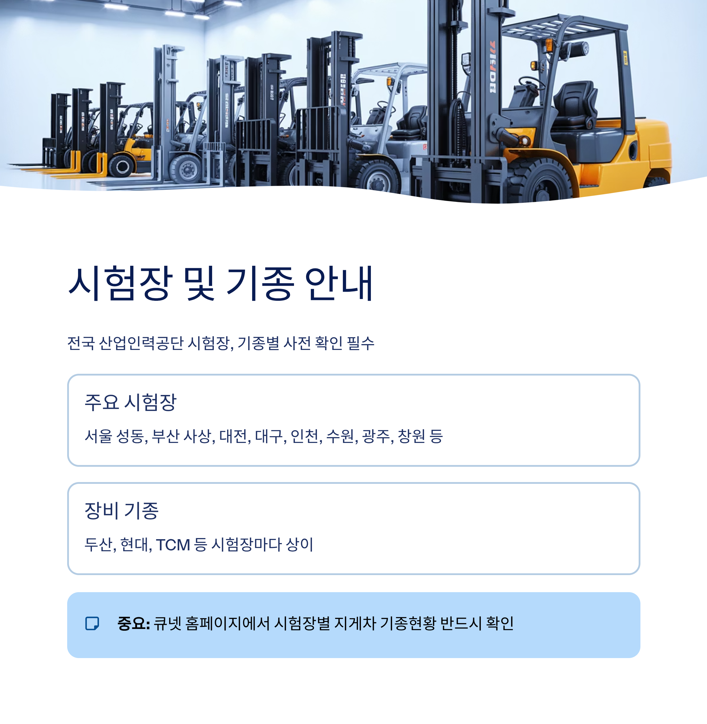 응시 전 반드시 큐넷 홈페이지의 시험장별 지게차 기종현황을 확인해야 합니다.