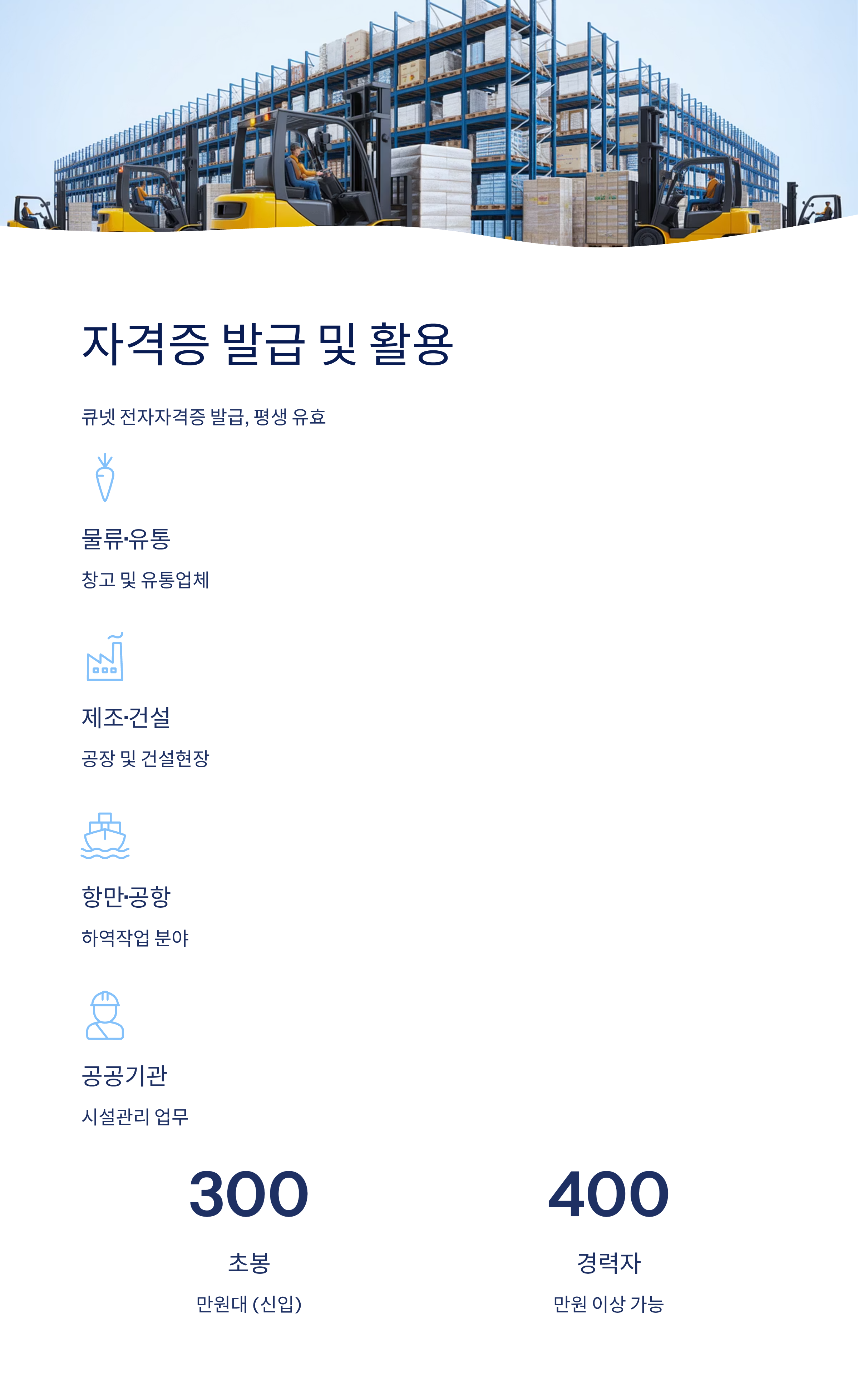 자격을 취득하면 산업현장, 물류센터, 제조업체 등에서 정식 장비조종원으로 근무할 수 있습니다.